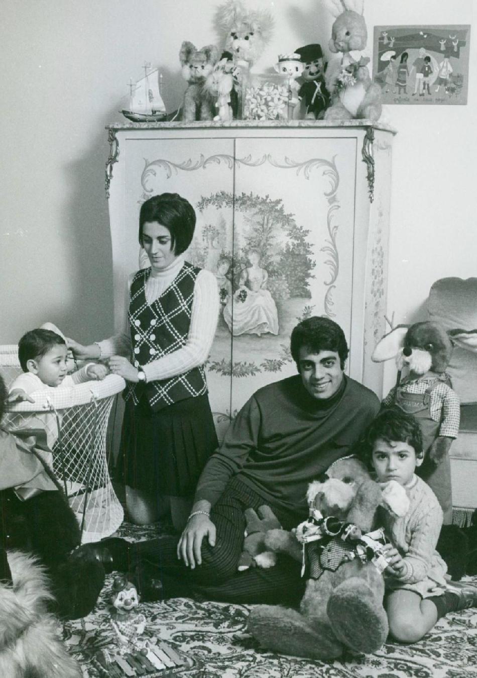 Here we have a French singer family, Enrico Macias with his wife, Suzy Leyris, and heir children (Jocya Macias and Jean-Claude Ghrenassia) during 1969. They are on the floor of the children's room, wonderfully populated with stuffed friends. Gaston Ghrenassia was born in Constantine, French Algeria (1938). His stage name is Enrico Macias. He is a French Pied-noir (settler) singer, songwriter and musician. He became a popular Musician (1960s). He came from an Algerian Jewish family in the then cosmopolitan city of Constantine. He began playing the guitr as a child. His father, Sylvain Ghrenassia (1914–2004) was a violinist in an orchestra that played primarily maalouf, Andalo-Arabic music. Gaston began playing in the Cheikh Raymond Leyris Orchestra at age 15. He trained to teach school, but continued perfecting his musical skills. As France at the end of the Independence War began to withdraw