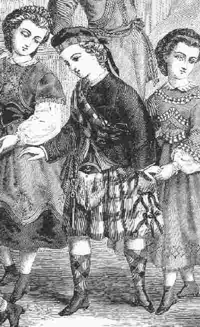French fashion magazines in the 1860s show boys wearing kilts as part of full Higland regalia, indestinguishable from the outfits being worn in Scotland. They are even wearing the sporans. The boy hears wears a Glengary cap. French boys also tams, but I do not know if they wore them with Highland kilts, we are inclided to think that they did. Note that the boys also werars a shoulder sash or tartan, sporan, dirk, and Argyle kneesocks.
