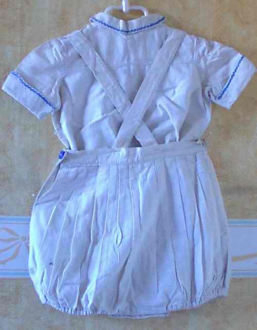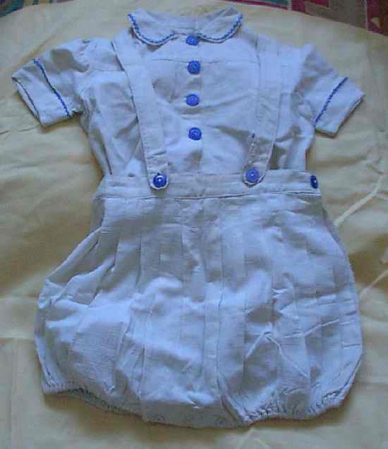 We have noted some made with pleats. There might be side buttons to improve the fit. Even the larger styles had buttons at the crotch. Unlike the one-piece suits for younger boys, these suspender rompers usually did not have the waste bands that tied in a bow at the back. The romper bottoms weremade with varying degrees of blocing out. Some were quite while others were more trim fitting. The large puff stule that blouced out was particualrly fashinable in the late 1940s and early 50s.