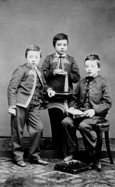 Cut-away jackets were a popular style for younger boys after the mid-19th century. They were worn throughout Western Europe and North America. We are not sure where the stgyle originated, France was one of the many countries where they were worn. We are not sure to what extent they were worn in the 1850s. We do not yet have French Daguerreotypes even though they were invented in France. They were made in much smaller numbers than in America. We do see cut-away jackets in the 1860s. Some were heavily decorated with embroidery and edging. Buttons were also used as part of the decoration. The pattern of the garments varied. They were usually short cut jackets, but we see some longer ones. There wee several styles. The classic Fauntleroy suit was done with cut-away jackets. The angle the jackets were cut away also varied. And we note both sharp and rounded corners at the waistline. The jackets were made wihout collars. They either buttoned at the neck or had a tab attachnmnts. They were worn both with and without vests. Early cut-away jackets commonly had the vests. We see boys up to about 10-years of age wareing these jackets. They seem most common in the 1860s and 70s, but we see them into the 1890s. As far as we can tell they were almost always worn with matching rather than contrastiung trousrs. They were worn with various trousers, including long pants, bloomer knickers, and knee pants. Long pants seem common in the 1860s, but shorter cut pants gradually became increasingly common, reflecting the general trend in trouser styles.