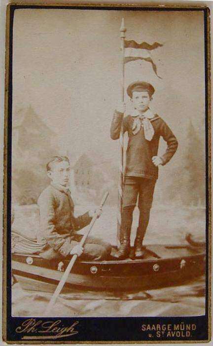 These boys were from from Saargemünd or St. Avold. (The photographer had two studios.) Both towns are located in Lorraine. Historians relate how the German seizure of Alsace-Loraine in the Franco Prussian War (1870-71) became a major national issue with the French people, poisoning relations with Germany and eventually leading to World War I. Less well studied is how the people in Alsace and Loraine felt about becoming German. The boy here looks to us to be quite proud to be German, holding a banner in the imperial colors. We don't know just who he was. Perhaps his parents were the Germans recruited to Germanize the population. or perhaps his parents were part of the local population before Germany annexed it. Saargemünd and St. Avold are situated just next to the modern German border. The portrait looks to have been taken during the 1890s. THe card mount style was popular in the 1880s and early 90s, but the boy's short-length knee pants look more like the 1890s than the 80s to us.