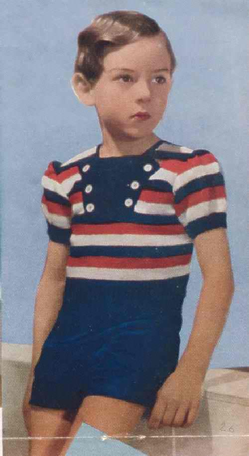 Knitted suits or combination outfirs were made in many styles and color combinations. Knitted blouse/pants combinations for younger boys are often called suits, even though there is not suit javket involved. These combination outfits were made with matching or contrasting blouse and pants. These suits were normally made with button-on styling, although suspender and bib-front styles werecalso available. These were more likely to be play suits. Belted styles were less common. They were very popular for younger boys up to about age 6. This sort of suit or combination outfit were very popular. Often they were knitted by granmothers who had more time and enjoyed making beautiful clothes for the little ones. Younger school boys might wear these suits with a smock for school. A French reader tells us, "The style shown on the previous page was still in style untill the later 1960s. If the weather was a bit cold; the garçonnet would add a wool vest or a pullover with his smock. This model were worn by boy till 6 years and also by older boys of 7-8 during summer hollydays specialy in mountains, sea-side, or for playing in a park." These suits declined in popularity during the 1960s, but were still commionly worn by pre-school boys. Nursery school boys would often wear such suits with their smocks and when he came home he might take his smock off and just wear the suit. This garment was rather inexpensive, an important consideration in the difficult years during and immediatly following World War II. A French reader tells us that, "Jobs were easy to find. There was plenty work. Unemployment in France was unkown till 1974." Clothes, however, were expensive and hard to find in the last years of the war and immefdiately following it. The granmothers could used wool salvaged from other garments. This soon changed, however, as the economy of France and other European countries rapidly recovered and the post-War economic boom began. By 1948 a large choice of fabric and clohing was again aailable to French consumers.