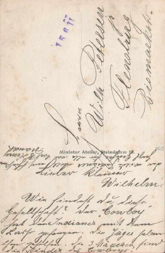 des Cowboys! Der wilde Indianer will noch schießen." I was signed, Herz(liche) Grüße für alle von Carl & Henry Brandt" Tranlated into English: Master Wilh Petersen jr, Flensburg, Bismarkstr. How do you consider the group? The "cowboy" has caught the Indian with the lasso. The hunters have helped him. The three
