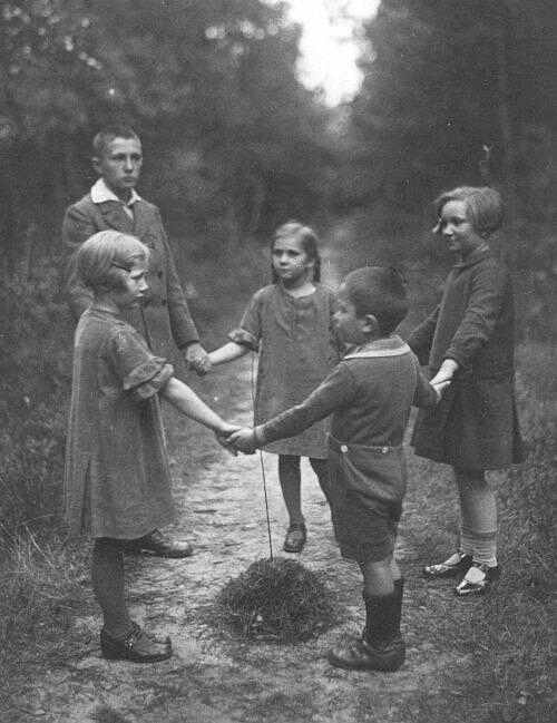 Children in all countries played ring games. These were commonly played by girls and younger boys. Ring games came in endless varieties. They mightbbe played on schoolplaygrounds, on city sidewalks, or even in the country. We do not yet have details on the ring games German children played, but we have begun collecting imaging of the children playing them. We believe that they are now less common than they once were. I thought at first the children had buried a be;oved family pet, but as there is no cross and it is on a parg way, this is clearly not the case. It sirely is a ring game. A reader writes, "I noticed the ring game the children are playing here. It looks similar to a game that we played in scouts a few yaers ago. We placed either a broomstick supported in a piece of square timber in the middle of the room, then all scouts (boys & girls) joined hands around the stick. The intention of the game is to pull each other towards the stick. Anyone who seperated when they were close to the stick was eliminated. The gane usually finished up with the strongest scout winning. Because of the different age groups and sizes, we usually ran three circles at a time."