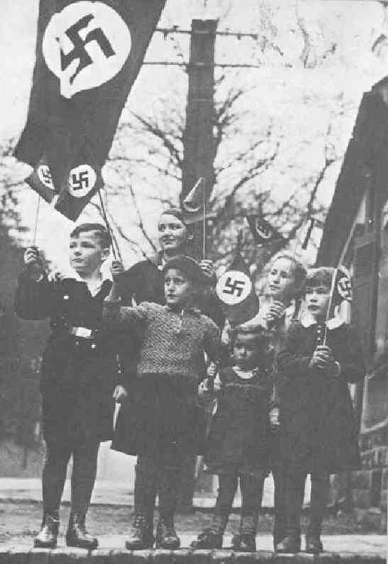 rally or parade waving their swastika flags. Their teacher stands behind