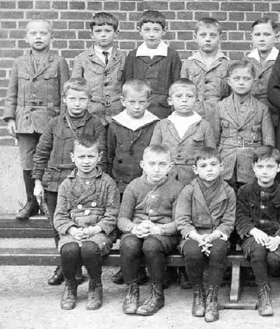 This class of younger children looks to have been photographed about 1915. They wear mostly smocks and sailor suits, often