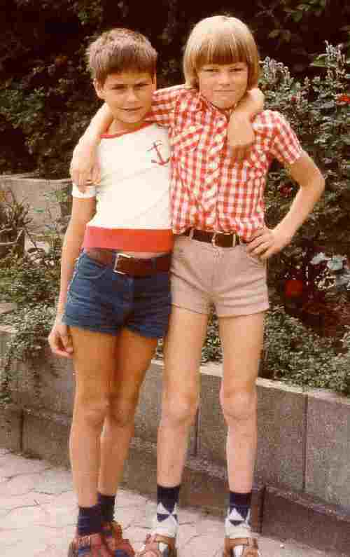 By the 1970s shorts had become increasingly rare anong older teenagers, but younger boys still commonly wore them--although more on a seasonable basis. Shorts were increasing;y being worn for casual wear. Casual shorts for play were made in various material. Denim became very popular. Boys wore quite short shorts in the 1970s. Little boys still wearing shorts during the winter might be dressed in long over the knee stockings or in beginning in the 1950s, tights. Some boys would wear them for warmth under long pants. Most German boys like other boys in Western Europe wanted jeans. The change was a slower in Communist Eastern Germany (DDR). But East Germany received West German (BRD) television and fashion easily breeched the Iron Curtain. By the time that the Berlin Wall fell, German boys were dressing in the indestinguishable pan-European styles. The West German boys were a bit more stylish as their parents had more money, but the same styles were commonly worn on both sides of the Wall. Lederhosen became popular for younger boys. Sneakers became increasingly popular, but open-toed sandals were widely worn. German boys commonly wore their sandals with socks--often dark or paterned ankle socks.
