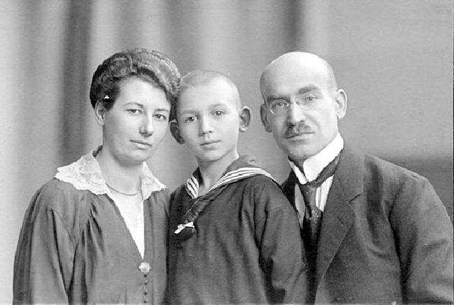 We assume that the adults are the boy's parents, but the man looks old to have such a young son. One HBC reader, however, writes, "I think that the man could easily be in his 40s. He's not wrinkled, just bald." The portrait is undated, but we believe was probably taken about 1910-15. We are not sure if it was taken before or during World War I. The portrait was a small family, only one son unless another son was in the army. The boy has a close-cropped head and wears a standard sailor suit. The portrait suggests a less formal relationship than is often shown in German family portraits (figure 1). his boy looks to have quite a set of ears, at least the shaved hair really make them stand out. I'm not sure why the shaved haircuts were so popular.