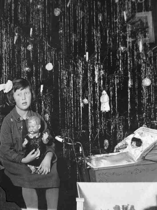 No holiday is more important in Germany than Christmas. And no German family album would be complete without Christmas images. And of course in Inge's special album we see Inge in front of the family Christmas tree. She is posing with her dearl little friends--two dolls. Notice the huge Christmas tree. Many German Christmas scenes we have found show very small, often spindly trees. Not Inge's family. We think this reflects the fact that the family lived in a small town or village with forests nearby. It also probably reflectys the fact that the family lived in comfortable circumstances.