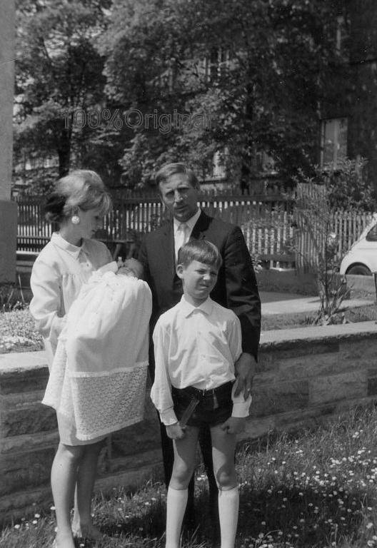 We note a young German family, we think in the early-1960s. It looks like a new suburban area made possible by the German Economic Miracle. The family has a rather American-looking front yard with what looks like a new Volkswagen. They had their photograph taken with their new baby and a boy who looks to be about 7 years old. He wears a long-sleeve white shirt, Lederhosen and white knee socks. We suspect they be headed to Church to Christen the baby. Both mom and dad are also dressed up.