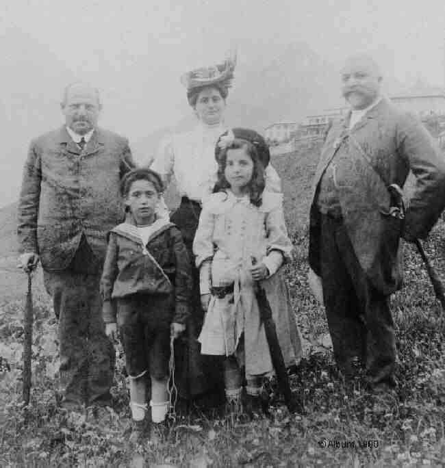 This photograph is undated, but we would guess about 1905-10. The family looks to be staying at a hotel resort in the mountains and are out for a walk. This could be quite expensive. So the families involved were if not wealthy were reasonably affluent. Going to mountain resorts to enjoy the scenery and taking walks in the surrounding woods and hills was very popular in Germany. We are unsure who the adults are, probably the grandparents. I'm not sure who the second gentleman is. The boy wears a sailor suit. The girl wears a white dress with a tam. Note the flower in her hair. Thegirl and men have umbrellas. The boy has strings in his hand. I am not sure what the purpose was.