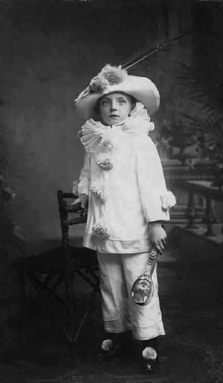 We notice various other costumes such as harlequins which might be translated as clowns. The two are different. American clows are strongly influenced by the circus experience. The harlequin evolved from a character commedia delle'arte. They were commonly dressed in colorful costume with multi-colred tights done in a diamond pattern. The harlequin characters often have a wooden (play) spear or magic wand. I think this was normally a costume for a boy. The children's harlequin costumes are generally done differently, with long bloomer like pants. Again these harlequin costumes do not look like play costumes. We do note several examples of children wearing them. Some of the costumes worn by children varied from country to country. These harelequin portraits were also popular in several countries. We note them in several different countries, including America, Britain, Canada, and we think France as well. Most of the harlequin outfits seem to be portraits taken before World War I. They are much less common after the War.