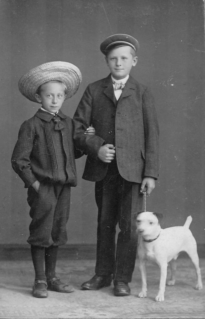 Social class, age, and gender all affected the types of headwear worn. We are just beginning to work on these conventions and hope to expand as HBC expands. We do not yet have information on social class conventions. The boys on the previous page look to be like boys from modest income families, except for the boy on the right. We suspect they were primarry school friends. Primary schools often included children from a range of social backgrounds. Age conventions are more easily assessed. Wide-brimmed sailor hats were popular for younger boys, but seem most common with boys from middle- and upper--class families. The brothers here provide information on both social-class and age conventions (figure 1). Gender is also easier to assess, although the number of images we can definatively date to the 900s is limited. Girls wore mostly hats and tam-like headwear. We do not see girls wearing caps to any extent. Some of the girls' styles were also worn by younger boys.