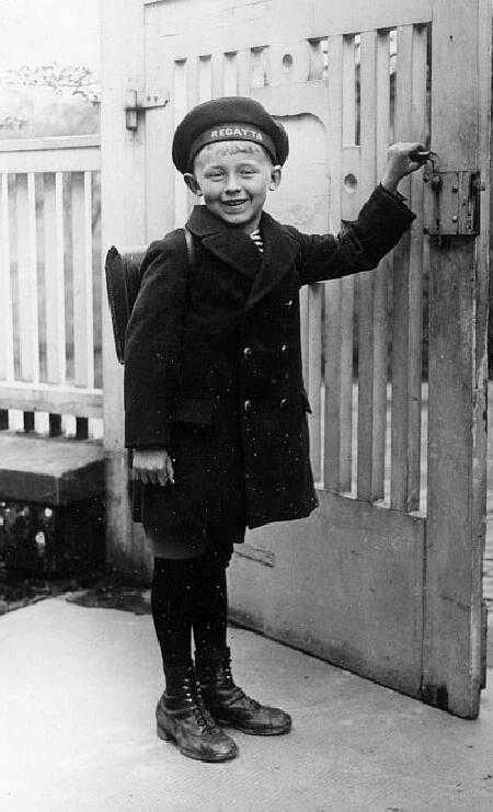 Figure 1.--Here we see little Helmut off to his first day of school in 1927. Poor boy. He apparantly didn't get a Schultüte, but he seems to be in a good mood. Notice his cap tally which says "Regatta". (Regatta is also a German word. Many German words related to ships are English imports.) American readers will recognize Helmut instantly as Arthur E. Neuman from "Mad" magazine. Image courtesy of the BP collection. |
