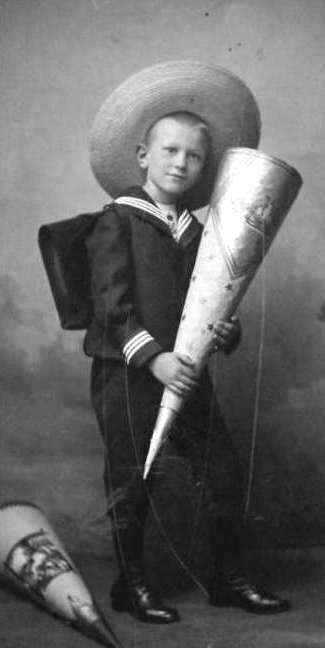The most destinctive feature of a sailor hat was the brim. This was especially the case for a wide-brimmed hat. We note sailor hats done with varying brim widths. The most striking ones were the wide-brimmed hats. Smaller boys seem most lost in them. Wide-brimmed hats became quite popular by the 1890s. At first we see more of these hats than sailor caps. Wide-brimmed sailor hats were especially popular for younger boys. Several images of German boys wearing broad-brimmed sailor hats are atrchived on HBC. A good example is an unidentified German boy. Sailor hats were normally worn with brims turned up. A fashion of turning down the brim became popular in the 1910s. Wide brimmed hats seem today rather a decorative rather than a practical headwear style. There was, however, a practical aspect to them. Light complexions were considered more attractive at the time. Thus for children a wide-brimmed sailor hat was a kind of early sun-safe garment. We continue to see wide-brimmed sailor hats in the 1900s, but in the 1910s they begin to decline in popularity, especially after the start of World War (1914). Wide-nrimed sailor caps wwereworn by pre-school boys and younger primary school boys. Here we see a 6-year old boy just befinning school wearing ione (figure 1). Girls also wore them. but the largest seems to be more common with boys. At leastv they looked larger. As older girls wore sailor hats, their hats were probably larger. We also seem to detect a social-class factor. They seem most common with boys from affluent families. Wide-brimmed sailor hats were almost always straw hats.