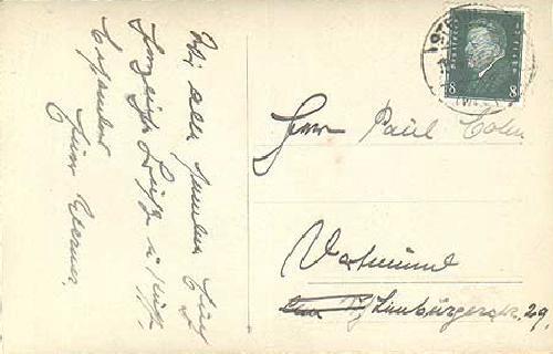 The German written script on the back of the postcard is difficult to read. It is addressed to Herrn Paul Cohn (or Holm). Cohn of course is a Jewish family name. The city is Dortmund. Street: Limburgerstr.29.