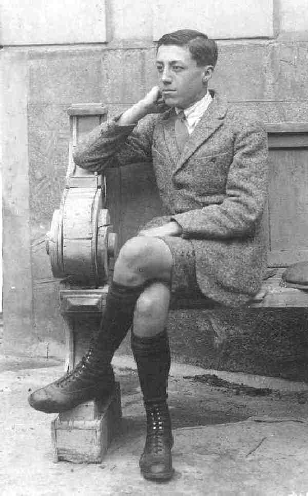 Older German boys wore long pants through most of the 19th century. We are mot entirely sure just when older boys began wearing kneepants. Nor or we sure how common it was. But we do note some older German boys wearing kneepants in the early 20th century. And we note it even after World War I into the 1920s. We note older German teen agers wearing kneepants in the early 20th century. We note boys at St. Stephen's Gymnasium, where we see I think two boys in one of the upper forms (about 17, I think) wearing knee pants. We are not sure, however that this was as common in Germany as it was in America. After the early 20s we no longer commonly notice it as knee pants declined in popularity. Most boys by age 17 wore either knickers or long pants. Some older boys from cobservative families might still wear knee pants or even shorts like the boy here (figure 1). We think, however, that most boys this asge wore long pants.
