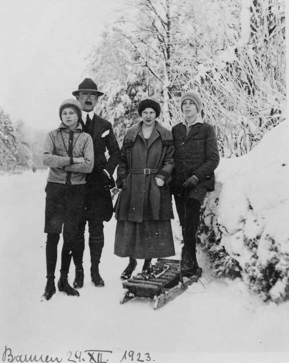German boys during the 1920s and 30s sill commonly wore short pants at 15 years of age. This as, however, the age than many families began buying long pants. In some cases boy in th mid-teens worn kbickers as a kind of mi-step toward long pants. All this varied from family to family. Here we see two teenagers wearing shorts inn1923 (figure 1). As it is winter they are wearing shorts with long stockings. Short pants were till standard, but we see more knickers and long pants during World War II years, in part because many boys were wearing the Hitler Youth winter uniforms which consisted of ski pants-- a kind of long knickers. After the war we see many teenage boys wearing short pants, in part becaue many families were so pressed by the collapse of the German economy.