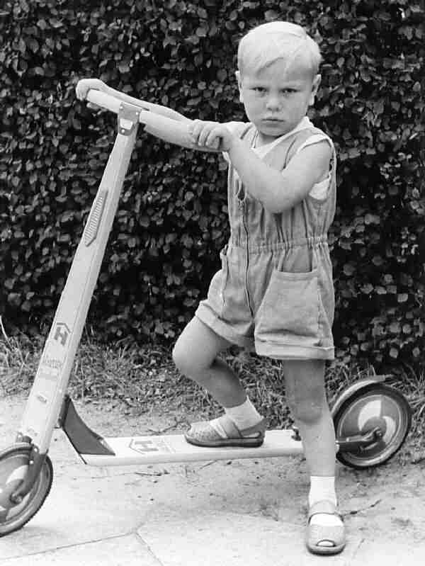 Figure 1.--This German boy wears a kind of short pants coverall outfit. The portrait is undated, but ws probably taken in the early 1950s. The boy here is playing with a wooden scotter, a popular play item in the 1950s. |