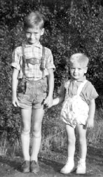 Age 3 years was a common age for wearing rompers. Thus us the age that separates toddlers from pre-school children. Here we see two German brothers were photographed in 1959. The older boy wears lederhosen and his younger brother a romper suit (figure 1). The boys look to be about 7 and 3 years old. The ages of boys wearing rompers have changed over time. They were still worn in the 1950s. They were still being worn by German boys in the 1960s, but the age seems to have steadily declined beginning in the 1960s. Usually the ages we specify are only estimates based on how old the chidren look. Very few of the snapshots we have found specify ages.