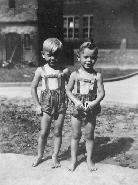 We also note romper pants with varied suspension: suspenders, h-bar, and bib-front. These seem to have been particularly common in Germany as a type of summer sun suit. The H-bar style seems the most common. Most of the examples we have found seem to date date from the 1940s and 50s. We have not yet noted German boys wearing just the romper pants, but this was not common in France either. We notice both play and dressy oitfits. These romper pants were worn with a variety of shirtys and blouses. Some seem to have been worn as sun suits or beachwear without shirts during the summer. We also notice them being worn as a kind of dressy outfit in formal portraits. Sometimes they were done as coordinasted outfits with sisters, usuall big sisters wearing skirts. We do not see German girls wearing romper pants.