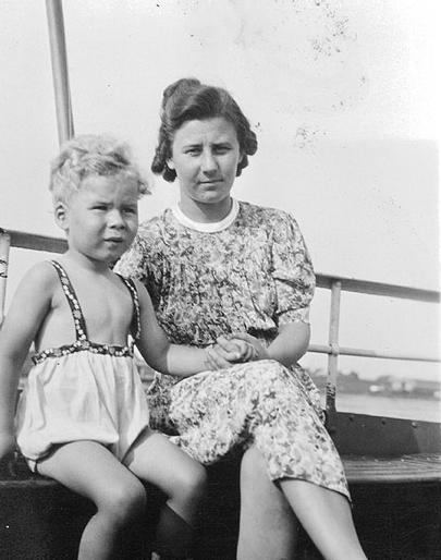 We note German boys wearing both dressy and play suspender rompers. The play rompers seem more common, but we see both types. The portraits taken in studios show them bring worn as dressy garments. This seems a dressy style for little boys. Most of the dressy rompers seem to date from the World War II occupation of France. There may jhave been some before, but most of these portraits of dressy rompers seem to date from 1940. The dressy rompers might be worn with fancy blouses. The French had to pay reparations to Germany and the unrealistic exchange rate imposed upon France made French goods very inexpensive in Germany. We suspect that the large quantirties of French clothing shipped to the Reich influenced German styles. On the previous we see a German boys wearing a dressy romper outfit with a fancy blouse after the War (figure 1). The much more numerous snapshots show suspender rompers being worn as play garments. We see quite a number of such images. Here we see a mother with her son on a warm summer day (figure 1). The boy is wearing suspender rompers without a shirt. It seems to have been a popular summer style for boys. As in France we do not see giorls wearing these romper outfits even for play. The boys might wear suspender rompers wihout shirtys, but we also see them being worn with a variety of shirts. The suspender involvedseem a p[art of the paomper pants and done in the same material. The age range seems roughly the same for both the dressy and play rompers.
