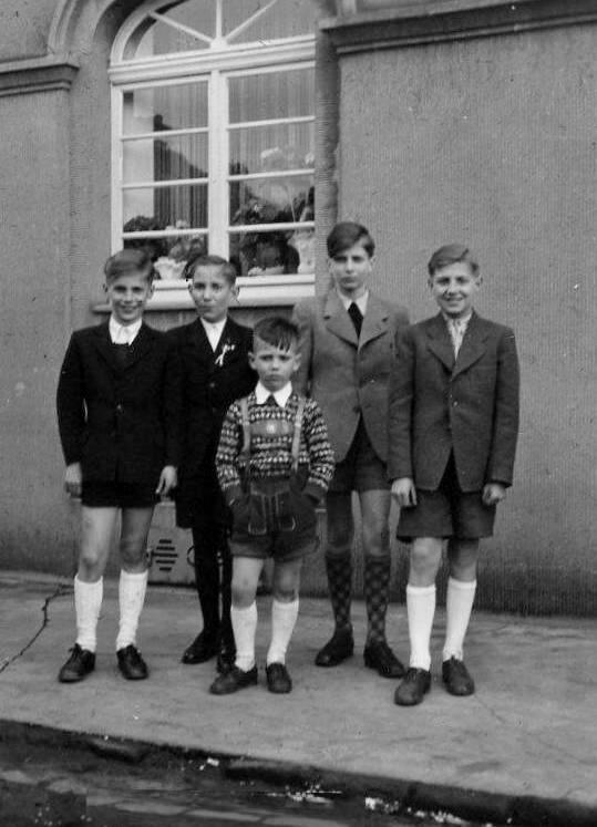 German boys have worn a variety of hosiery with suits. There are associations between cerain types of hosiery and pants. This has changed over time. We are less sure what boys wore with long pants which were widely worn throughout the 19th century. As younger boys began to wear shotened-length pants at mid-century, avaialble photographic images show German boys wearing a range of socks and long stockings. We mostly see boys wearing long stockings with kneepants in the 19th century, although there was some seasonal and functional variation. We aldo see bloomer knickers and they were akso worn with long stockings. By the 1890s an increasing number of boys and older boys were wearing kneepants. This trend continued into the 20th century. We begin to see short pants suits in the 1910s. After World War II, this trend continued, although at first short pants were very long. . Kneesocks were always worn with knickers and usually with short pants suits. We have not noted German boys commonly wearing short pants suits with short socks until the 1960s. Knicker suits by the 1920s and short pants suits were also worn with long stockings, but kneesocks became much more common. Some younger boys wore short pants suits with long stockings. This was most common during the winter in cold weather. A good example is an unidentified German boy, probably in the 1930s. While German boys most commonly wore long stockings for warmth, they were also wore long stockings for dress occasions such as First Communions or Confirmations. We note that black long stockings and white knee socks were sometimes worn with suits for formality. Styles of hoiery for Ledehosen when worn with suit jackets were more varied. Knee socks were probably most common. After the 1960s, long pants suits became increasingly common making it difficult to determine the hosiery type. As best we can tell, tights were not commonly worn with suits. This is in part because as tights were becoming popular, short pants suits were becoming less popular. Another factor us that German boys by the 1970s were not wearing suyits as commonly as they did earlier.