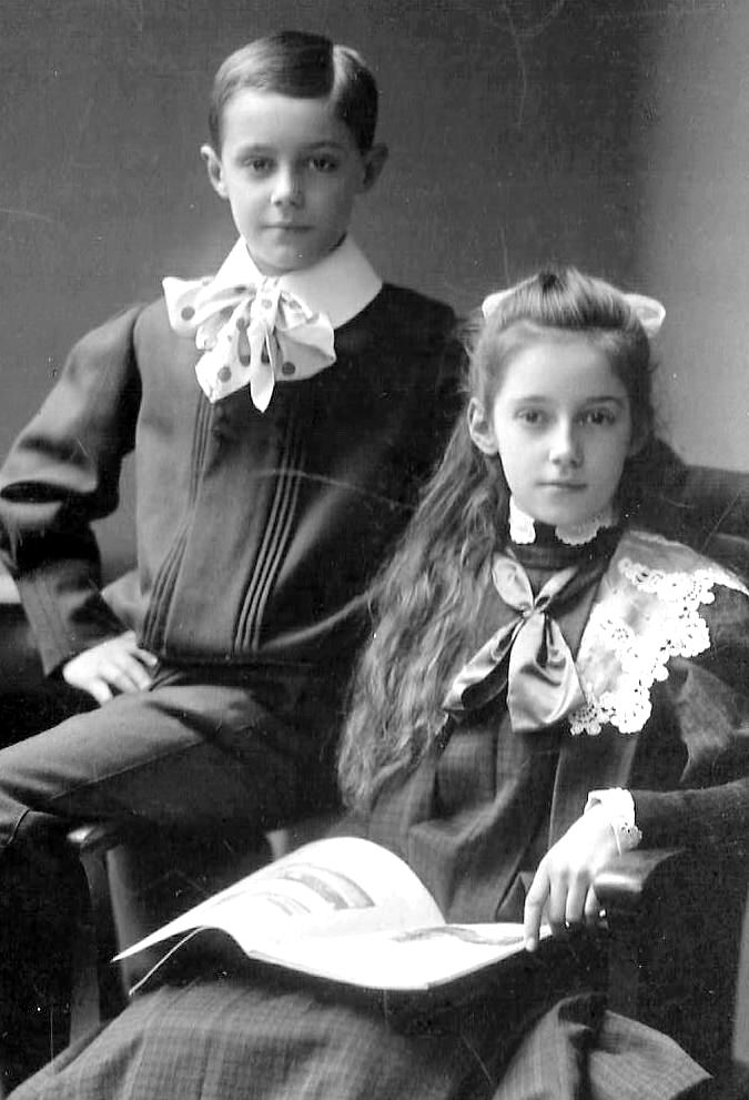 Figure 1.--These imacuately groomed German siblings in this cabinet card look to be about 10-12 years old. The boy wears a blouse suit jacket with an Eton-like collar and floppy bow. The suit is complete with knickers and long stickings. The girl has long hair and and a hair bow. She wears a dress that seems to have a lace collar as part of the dress. The portrait is undated, but we would guess was taken in the 1900s in part because of the mount style.