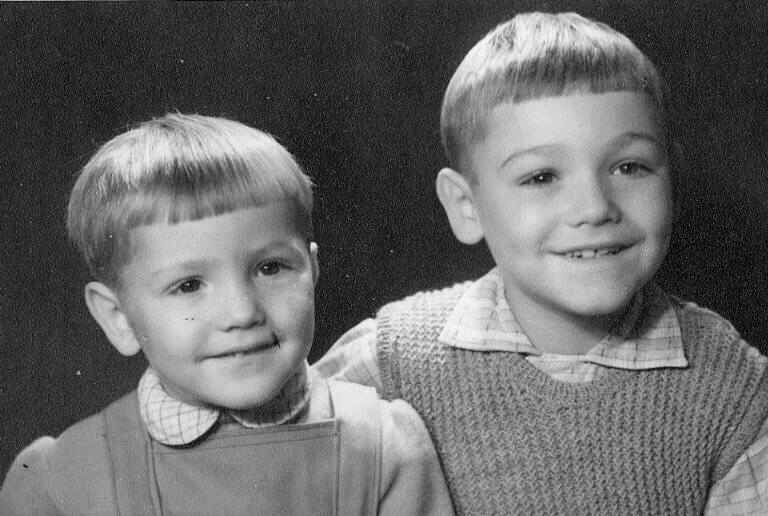 Figure 1.--These German brothers had their hair cut in bangs. Notice how short they are. The fringe on some bangs covered almost the entire forehead. The portrait was taken in 1959. Bangs were a style especially popular for younger children, both boys and girls. |