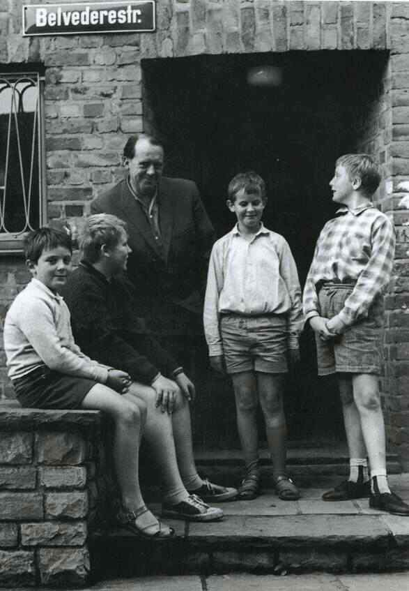 Böll married Annemarie Cech during the War (1942). He writes that she "has been irreplaceable, not only as my wife and companion, and not only as fellow experiencer and fellow sufferer in the fascist drama during the Nazi reign in Germany, but also for her critical awareness for language." Their first child, Christoph, died (October 1945). He writes, "Our sons Raimund, René and Vincent were born in 1947, 1948 and 1950 in the rubble of Cologne and grew up there." We note a picture of the adult Heinrich Boll (1958) in Cologne with his three sons--Vincent, Raimund, and Rene. His nephew Viktor is shown standing at the far right. The boys all wear short trousers. Vincent, the youngest boy, wears sandals with no socks. The other boys all wear