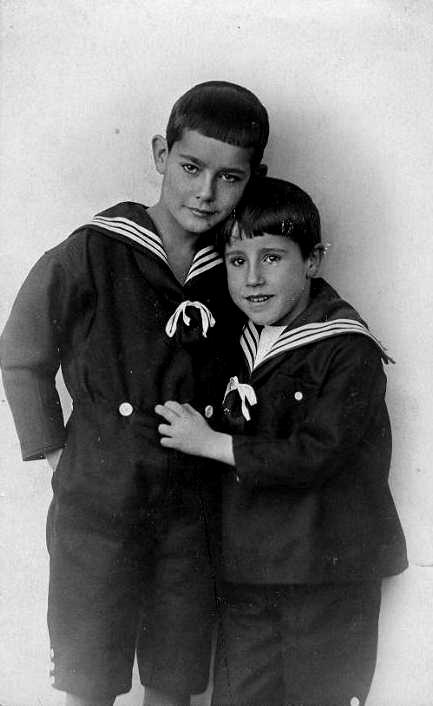 Sailor suits were still popular in middle-class families during the 1920s. The brothers here both wear sailor suits (figure 1). The older brother wears a button-on suit. The younger boys wears a blouse than extends over the waist. Only the younger boy wears a dickey. Both boys wear knee pants. These two Berlin boys are Rudolf and Owlald Struckmeier. They had their portraits taken in 1922. The boys look to be about 5-8 years old. Body posture can be reveiling in these old photographs. We would guess that the boys were very close. Both boys have their hair cut in bangs.