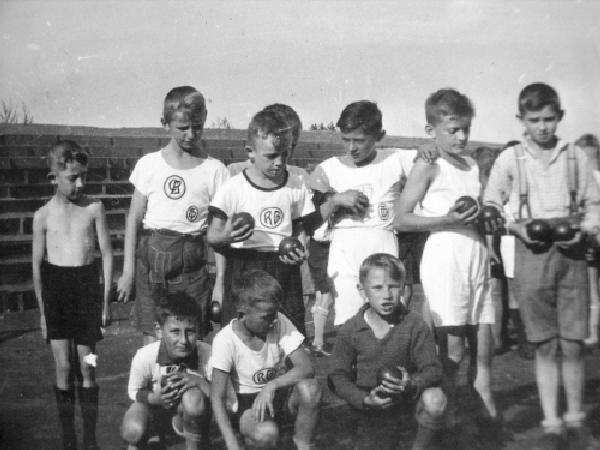 The album has numerous photographs of boys doing athletics. We think these images are from a secondary school. There are no good photographs pf the school, but many of the photographs have a brick wall in the background. Only one is dated, a 1931 photograph. Like the primary school photographs, the athletics photographs do not seem to focus on any one boy. We note several boys have athletic shirts with "RG"". We note other shirts, perhaps an event between schools. I wonder if this is the initials of the school. We see the boys doing various events, including shot puts and high jumps as well as a school tug-of-war. We notice boy younger and older boys involved in the events, conforming our speculation that it is a secondary school.