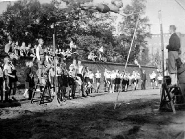 The album has numerous photographs of boys doing athletics. We think these images are from a secondary school. There are no good photographs pf the school, but many of the photographs have a brick wall in the background. Only one is dated, a 1931 photograph. Like the primary school photographs, the athletics photographs do not seem to focus on any one boy. We note several boys have athletic shirts with "AG"". We note other shirts, perhaps an event between schools. I wonder if this is the initials of the school. We see the boys doing various events, including shot puts and high jumps as well as a school tug-of-war. We notice boy younger and older boys involved in the events, conforming our speculation that it is a secondary school.