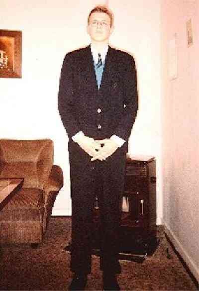 These images from winter 1996 showing me as an 14 year old teenager, wearing my typical outfit for special occasions in the Autumn or winter months. I wore a navy-blue suit with an white shirt and a matching striped tie. Over the shirt, I wore a light-blue sleeveless sweater (this kind of sweater has in Germany the misleading name Pullunder) matching the color of the square patternd socks, besides black patent-leather shoes. As a 14 year old boy I began didn`t feel unpleasant, wearing a suit. Suit were not longer commonly worn, bit iit was better than wearing short pants and kneesocks.