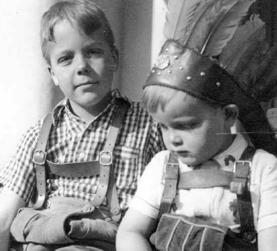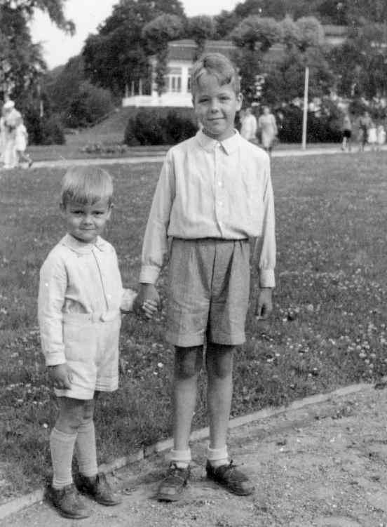 Both myself and my little brother wore lederhosen. Mine were real leather, Ny brother's lederhosen were made of [????]. The photograph was taken in our back yard (garden). Notice the checerked shirt I wore with my lederhosen (figure 1).
