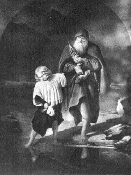Figure 1.-- Here we have a picture showing a friar and an altar boy crossing a stream. I have no information about the image but it is taken from a German porcelain lithophane. The priest seems bringing the Holy Communion to sick people. |