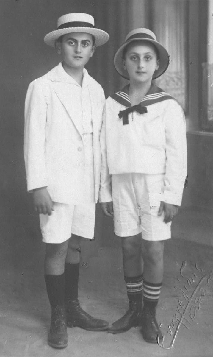 The 1930s was surprisingly a period of wealth and stability for Greece. It is often mockingly called belle epoque. The economy as in the rest of Europe was adversely affected affected by the world-wide depression. Sailor suits were still worn, but not asmuch as in earlier years. Boys from affluent families were dressed in the latest fashions, often looking rather like a well dressed boy in England or France. The poverty that still affected Greece, however, meant that many boys at this time could not dress very well. Uniforms were very popular with boys, both Scout uniforms and the uniforms of the new EON movement which was active in the 1930s. Most Greek boys in the 1930s commonly wore short pants, especially in rge waem summer months. Kneesocks were not as common as in the more northerly European countries. Many boys wore sandals or went barefoot.