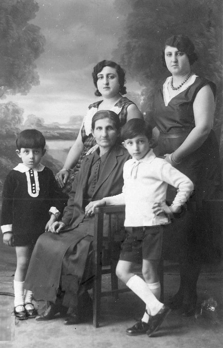 Here we see see another Grek impage of three family generations in a portrait. We see the elderly grandmother, two daughters, and two grandsons. The boy look to be about 3-7 years old. The portrit is undated, but this and the postcard back portrait suggests the 1930s. The yoinger boy wears a Fauntleroy-styled short pants velvet suit. It may be a one-piece outfit, but we can not tell for sure. Floppy bows has gone out of style. But we have a slightly frilled collar and decorative front with matching wrist cuffs. The older boy has a white or light-colored, collared sweater and tie front worn with dark short pants. Both boys have white socks and strap shoes. We see both boys and girls waring strap shoes at the time. This was the case in many European countries. The younger boy wears three-quarter socks and the older boy kneesocks. The younger boy has his hair done in bangs while the older boy has parted hair. At the time many Greek boys had close-cropped hair.