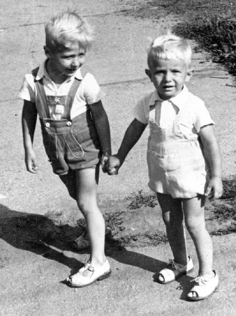 Here we see two of the cousins photographed separately. We assume that they are brothers. They look to be very close. They are about 3-6 years old. Both boys wear standard white shirts. The older boy wears H-bar shorts. They are made to look like Lederhosen complete with an enbroidered design on the cross-bar of the haltar-like H-bar straps. Hungary was of course associated with Austria for four centuries. They are of course not Lederhosen because they are cloth not leather. The younger boy wears bib-front suspender shorts. Curiously the straps seem to connect to the pants orv back of the bib and not the bib front. The boys wear sandals. Note the open toe. That was not common in many other countries (England, France, and Germany) where sandals were widely worn. We do not know enough about Hungary to known how common this was. It may have been a post-World War II style.