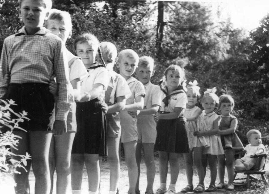 The photographer in the family liked to line the cousins up for group photographs at grandmother's home. Here we see the same children photographed in front of granhdmother's house in 1957, lined up by height. As they are wearing the same clothes, the photograph was probably taken the same day. The boys all wear short pants and the girls dresses. One mother must have liked sailor suits as one boy wears a sailor suit and two of the girls wear sailor dresses.
