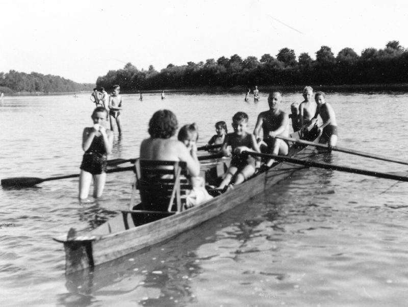 Hungary of course is an inland country, but there are lakes and rivers which are populr summer bathing sites. Here we see some of the unidentified family members on a family outing during 1960. They are in a small boat on the Tisza River. The family is in the boat. Some masy also be in the water. It looks to be a popular bathing site.