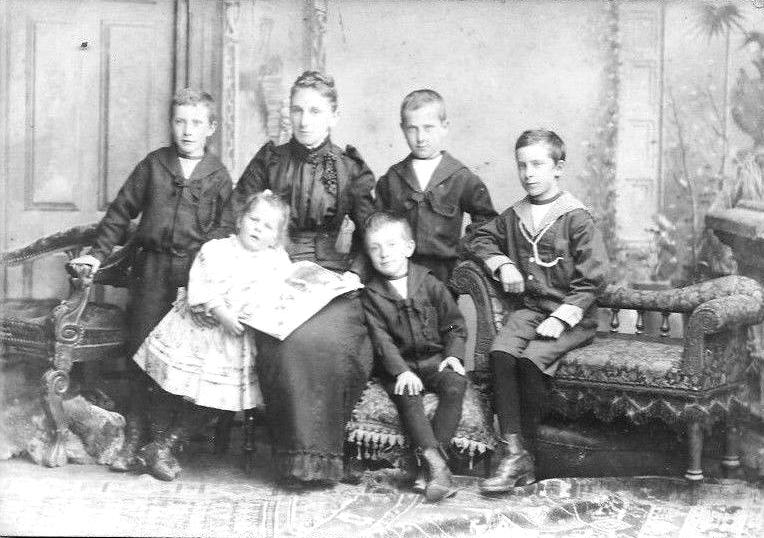 Here we see a Dublin mother and her fice childrem. They are a girl and four voys about 3-12 years of age. We notice another unidentified family, this one in Dublin, also probably in the 1890s. . The boys are all dressed in sailor suits. Three of the boys wear the same plain sailor suits without any stripe detailing. The older boys wears a fancier suit. They all appear tobe knee oants suits. The portrait is not dated, but mothers dress suggests the 1890s. The studio was Lauder Bros. in Dublin. The children all ear black long stockings and high-top shoes.