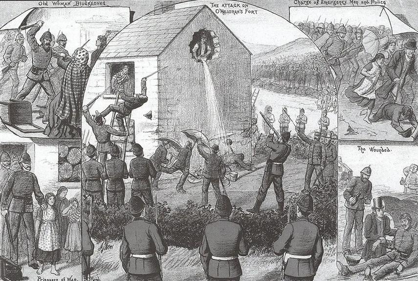 This was legsal forum and system that was the first important step towards the break-up of the old estates in Ireland. The Court ordered that the O’Halloran's rent be reduced to £22-10s. The O'Hallorans insisted, however, that the vreduced rent was unfair, pointing outthat their rent had been only £13-10s. And the O'Hallorans stil owed 2 years’ back. Col. O’Callaghan insisted that the higher rent was justified because he built a new two-story slated house and outhouses. The O'Hallorans prepared to resist the eviction. The built defensives, they built earthworks, dug atrebch ariund the cottage, barricaded the windows and doors, and knocked out small openings. They stockpiled pitchforks, wooden poles, and sandbags. A substantial crowd of some 8,000 people gathered in the village daily--mot knowng jutwhen the baliff woukd rruive. [Freeman’s Journal (May 1887)] The eviction pary finally arived (June 2). The party consisted of acting Sheriff, the O’Callaghan agent, a Resident Magistrate, the Royl Irish consatbualry, the 2nd Royal Welsh Fusiliers, bailiffs, and 14 emergency men. The militia and emrtgrnvy mnemmwere present because the ceviction had become so highly publicized attrvtuing a crowd that gathered daily in the village