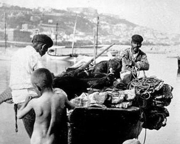 An Italian reader writes, "Rightly you write that fishermen's children were commonly barefoot 'throughout Europe', except during the winter in northern countries. In the South, indeed, as for example in Naples, often the children went barefoot all year round. In Naples that was true not only for fishermen's children. Moreover, we have photographic evidences that in Naples often fisherboys went unclothed also in late-19th and early-20th century, at least when they worked. That didn't change over the time for centuries. We have a chronicle dated 1632 telling us that in Chiaia, the Neapolitan seaside, 'the children goes naked throughout all the Summer not only along the seaside, but also through the streets and at home.'" [Marcheix, p. 120.] Most fishermen use small boats and conduct short trips into the Meditrranean or Adriatic Seas. Thus it was commonly a family affair. This affecteed the applicability and enbforceibility of child labor laws. Younger children might help sell the catch on shore. On the previous page we see a boy who is probably selling fish that his own father has just landed (figure 1). Notice the complete lack of ice. Older boys would help father in the boats. Girls rarely worked on the boats. Fishing families tended to be very poor. Polution has become a major problem in recent years affecting the catch.