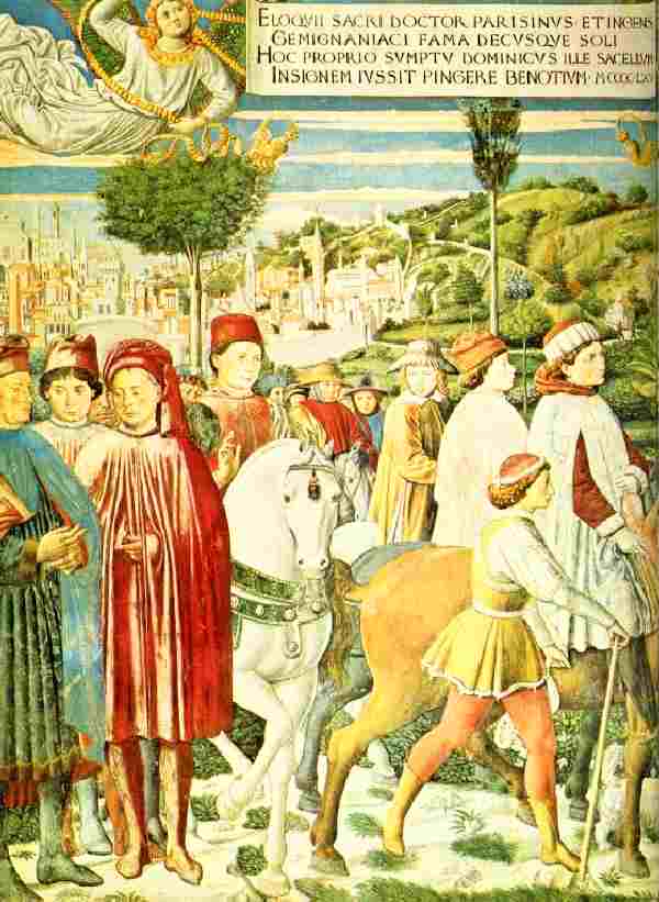 The fresco here depicts a historical scene, St. Augustine leaving Rome for Milan (figurec1). Note the Roman skyline in the background. The fresco was painted by Benozzo Gozzoli in 1463, the year Pope Pius II began building the new St. Peters. Note although this is a historical scene that the characters are depicted in contemporary clothes. Thus we have a wonderful illustration of how Italian men and youths dressed in the mid 15th century. Notice that the older men are wearing dress-like rones, but cut shorter robes than in earlier decades. Here we see the youth wearing a kilt/skirt rather than trunk hose. Younger men hemlines in the 15th century ended above the knee to show off two-tone hose. As the period advanced, men’s hemlines ascended higher and higher up stockinged legs.