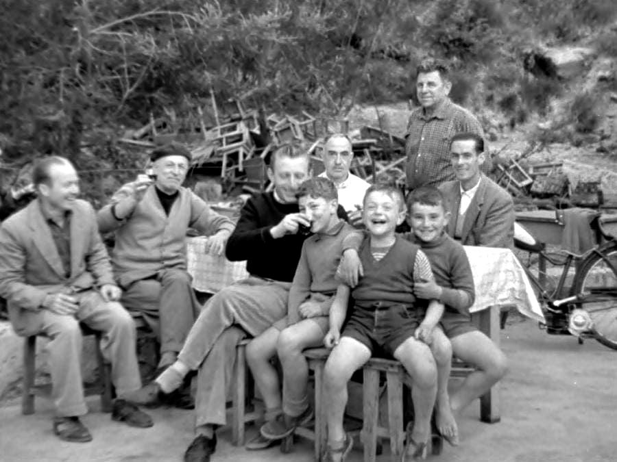 America before the automobile had becomes the world's greatest industrial power. Henty Fird nd the Model-T Ford resulted in American eclipsing all other industrial powers. At the time of Wotrld War II, most of the cars and trucks buit in the world were built in America. After the War this continued and we massive huge highway behemoths dripping with chrome, like the 1952 Buick Rodmaster wesee on the prvious page taken on taken in Varazze, a tourist resort near Genoa, on May 6, 1955. Also interesting is what wa going on in the cafe in the background. This photo here was taken on the same day of the previous one with the Buick Roadmaster. You can see the same child. In the previous photo you can see the sign of a cafe bar. This photo could be taken in the bar backyard. The Italian Economic Miracle was just beginning. You can see a bike that still was a common vehicle. This bicycle has a little motor added. The Vespa of course would be a part of yhe Italian Economic Miracle. Still few people had a car, especially in a little town. Many children were sdtill barefoot, although it was no longer virtually inversal in tyhe villages and pooer communities. A man lets a boy taste the wine. Nowadays that is seen as inappropriate, but not at the time.