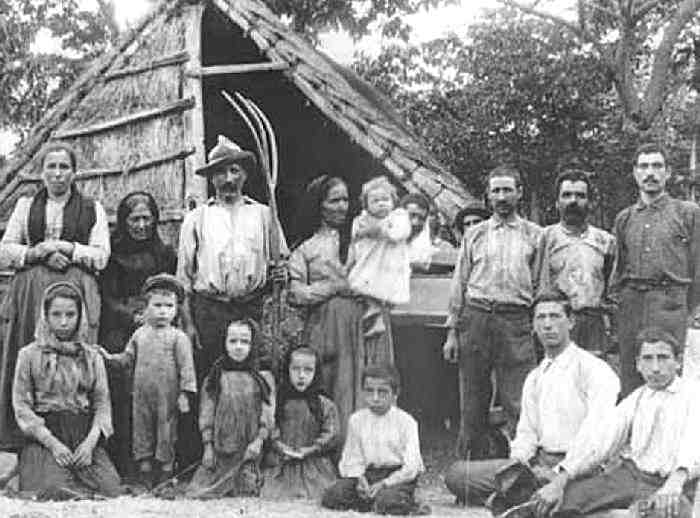 This farm family lived in Fosciandora, a village about 100 km south of Florence. The photograph is undated, but looks to be taken in early 1900s. We wiould guess the 1910s. I'm not sure that is their home in the background. It does not look very substantial. It may be just shelter used while working in the field. They may have had a more subtantial home in the village.