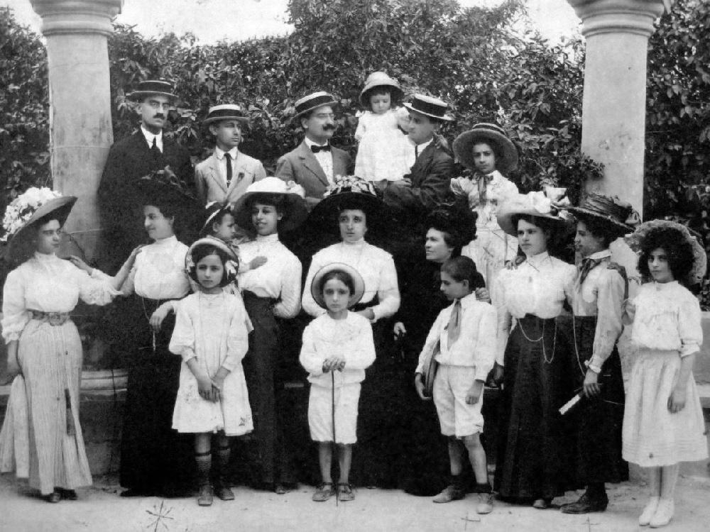 Here we see the Ridola family, a wealthy landowning family. This portrait was taken in Miglionico, a town in southern Italy, 50 miles south of Bari on the Adriatic near the boot of the Italian peninsula. Southern Italy was largely agricultural and in areas still virtually feudal. It was the poorest area of Italy. Unfiortunately we know nothing about the Ridola family and thir estate. The photo is undated, but we would guess was taken in the early 1910s. An Italian reader writes, "I think too that the photo was taken before the First World War. The clothing could suggest even a bit earlier, except boys' hosiery and footwear. A boy is wearing shoes with ankle socks and the other one closed-toe sandals without socks" We are not sure if the portrait is taken on their estate or not, The kids are all done up in white. The portrait in particular shows off hat styles. The men wear boaters. The women wear huge, highly decorared hats. The kids also have hats. The girls' hats tend to be larger and we see hair bows as well. The boys also have hats, although one boy is holding rather than wearing his hat. Some of the boys and girls have similar hats, although the older girls have hats more like their mothers' hats.