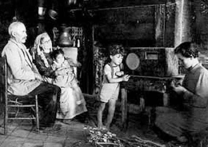 This unidentified farm family was photographed in their home listening to the radio. The photograph was taken in southern Italy after World War II during the late 1940s. The older individuals look to be the grand parents.