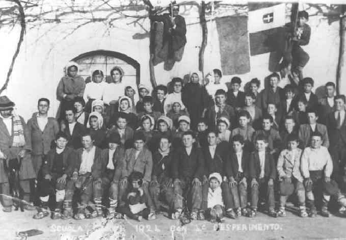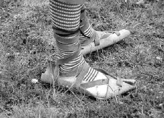 An Italian reader tells us about "ciocie" (singular "ciocia") which were typical footwear in the country near Rome. The "ciocie" were very primitive footwear. They were a leather piece joined to leg by laces. Men and women, adults and children wore "ciocie". Today "ciocie" are worn only in folk festivals, but in little villages they was worn before 2nd World War. "Ciocie" was worn with socks or with a cloth enveloped to the foot, but also with bare feet. In the 1st picture we have a group of school children in 1924. They lived in ca rural village south of Rome.
